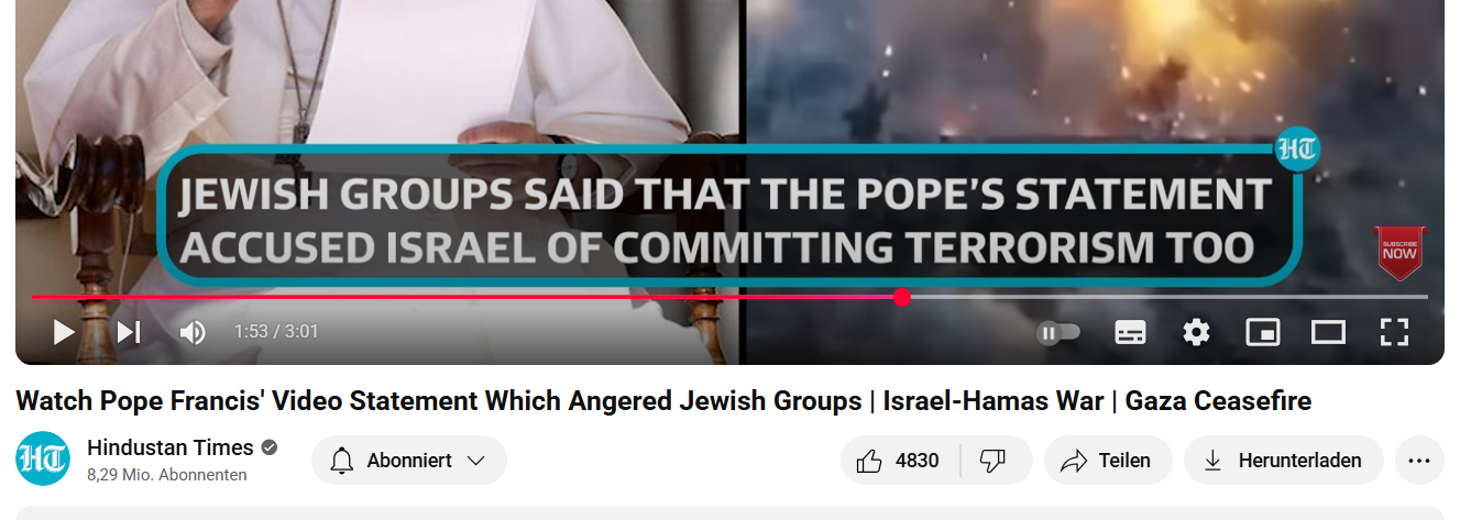 Οι Hindustan Times βλέπουν τα πράγματα διαφορετικά από εμένα. Ο Πάπας έχει κατηγορήσει τόσο τη Χαμάς όσο και το Κράτος του Ισραήλ για τρομοκρατία. Ίσως έχει λόγους για την άποψή της. Θα ήθελα να ανεχτώ αυτή την άποψη με ανοχή.