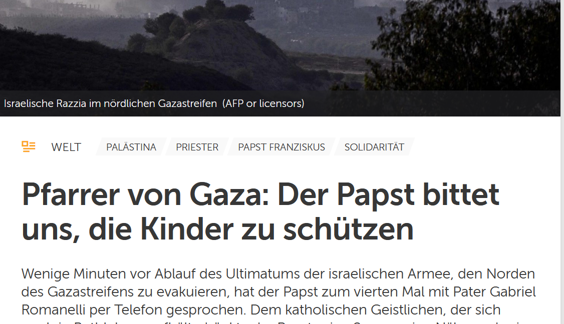Ο πατήρ Γαβριήλ Ρομανέλι, εφημέριος της Αγίας Οικογένειας στη Λωρίδα της Γάζας, περιγράφει τη ζωή εν μέσω πολέμου και καταστροφής ως έναν διαρκή εφιάλτη. Η χριστιανική κοινότητα στη Λωρίδα της Γάζας αγωνίζεται για την επιβίωση — χάνοντας μέλη, ελπίδα και αξιοπρέπεια στη διαδικασία.