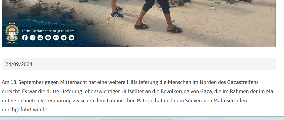 Insgesamt wurden 40 Tonnen Lebensmittelpakete zur Verteilung durch Malteser International, dem weltweiten Hilfswerk des Malteserordens, an das neue Verteilungszentrum geliefert, das vom Lateinischen Patriarchat in der Nähe des Patriarchatsgebäudes im Norden von Gaza eingerichtet wurde. Neben haltbaren Lebensmitteln wie Kichererbsen (in Dosen), Datteln und Fleisch enthielt die Lieferung für viele Menschen zum ersten Mal seit Monaten wieder frisches Obst und Gemüse, das für ihre Gesundheit lebenswichtig ist. Mit dieser Hilfslieferung sollen 1.000 Familien mit je fünf Personen einen Monat lang unterstützt werden.