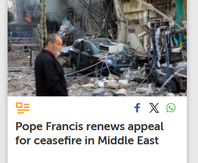 Pope Francis renewed his appeal for a ceasefire in the Middle East and warned against spiraling into an even bigger war, at the conclusion of his Sunday Angelus address in the Vatican.