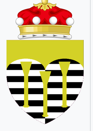 Per pale Argent and Sable, five Bars counter-changed, over all three Trumpets bells upwards Or, a Chief engrailed of two arches Or.